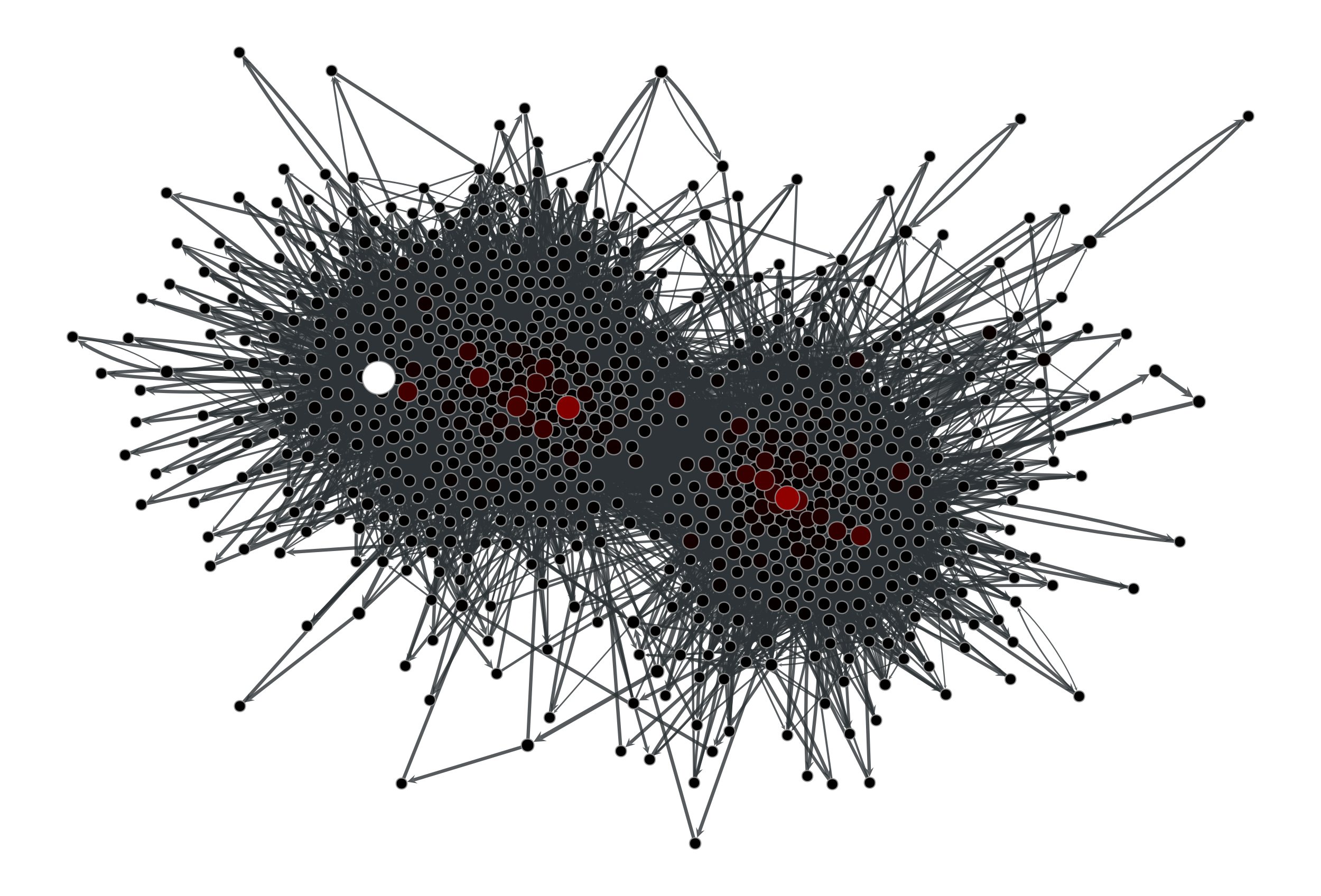 >>> g = gt.collection.data["polblogs"] >>> g = gt.GraphView(g, vfilt=gt.label_largest_component(g)) >>> vp, ep = gt.betweenness(g) >>> gt.graph_draw(g, pos=g.vp["pos"], vertex_fill_color=vp, ... vertex_size=gt.prop_to_size(vp, mi=5, ma=15), ... edge_pen_width=gt.prop_to_size(ep, mi=0.5, ma=5), ... vcmap=matplotlib.cm.gist_heat, ... vorder=vp, output="polblogs_betweenness.pdf") <...>