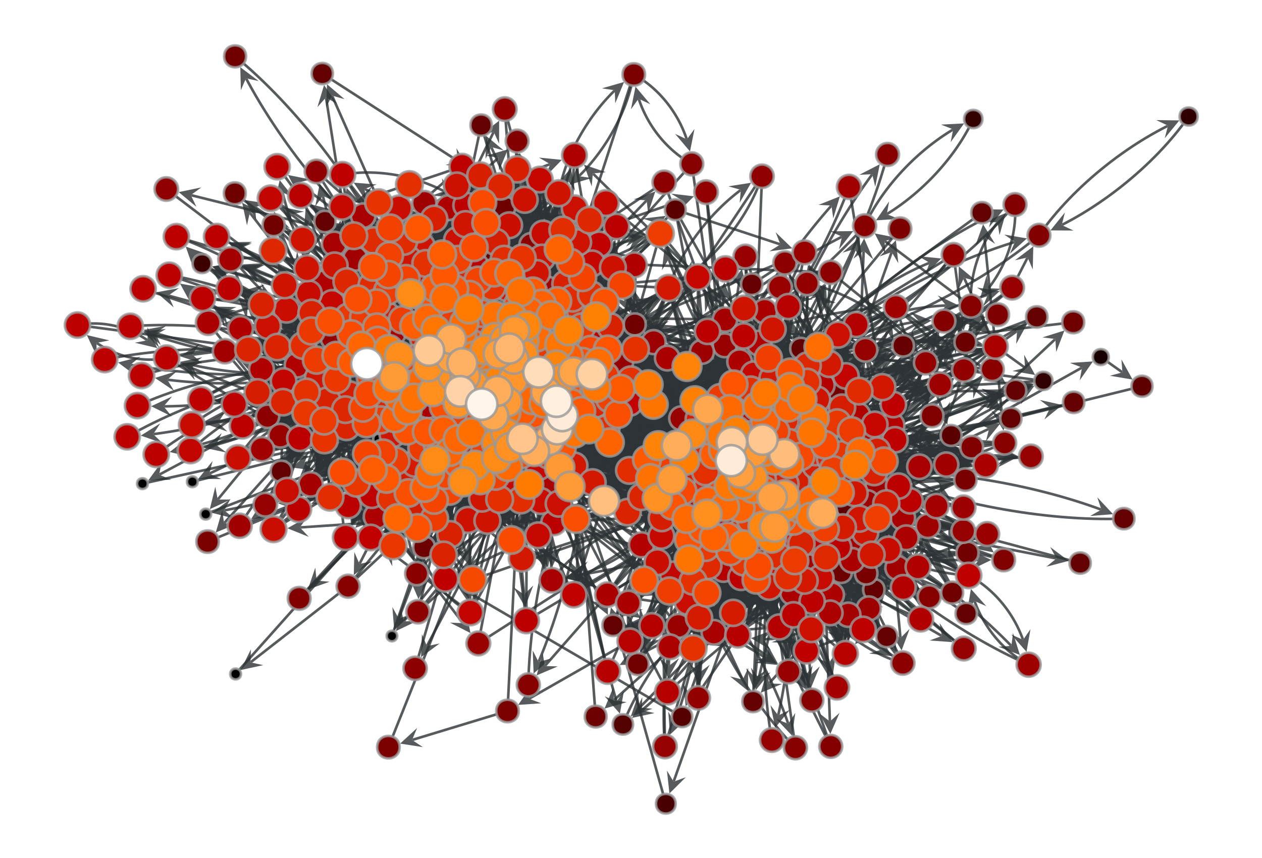 >>> g = gt.collection.data["polblogs"] >>> g = gt.GraphView(g, vfilt=gt.label_largest_component(g)) >>> c = gt.closeness(g) >>> gt.graph_draw(g, pos=g.vp["pos"], vertex_fill_color=c, ... vertex_size=gt.prop_to_size(c, mi=5, ma=15), ... vcmap=matplotlib.cm.gist_heat, ... vorder=c, output="polblogs_closeness.pdf") <...>