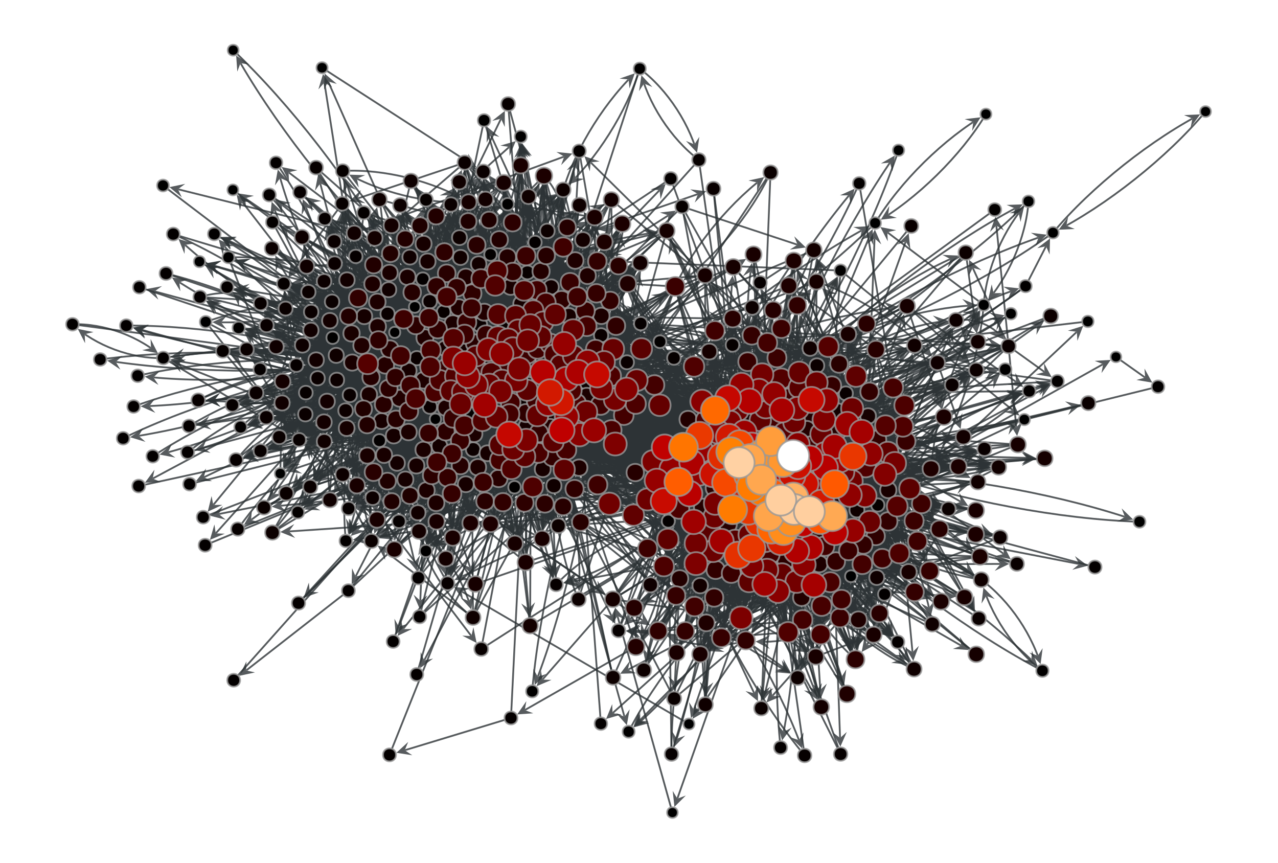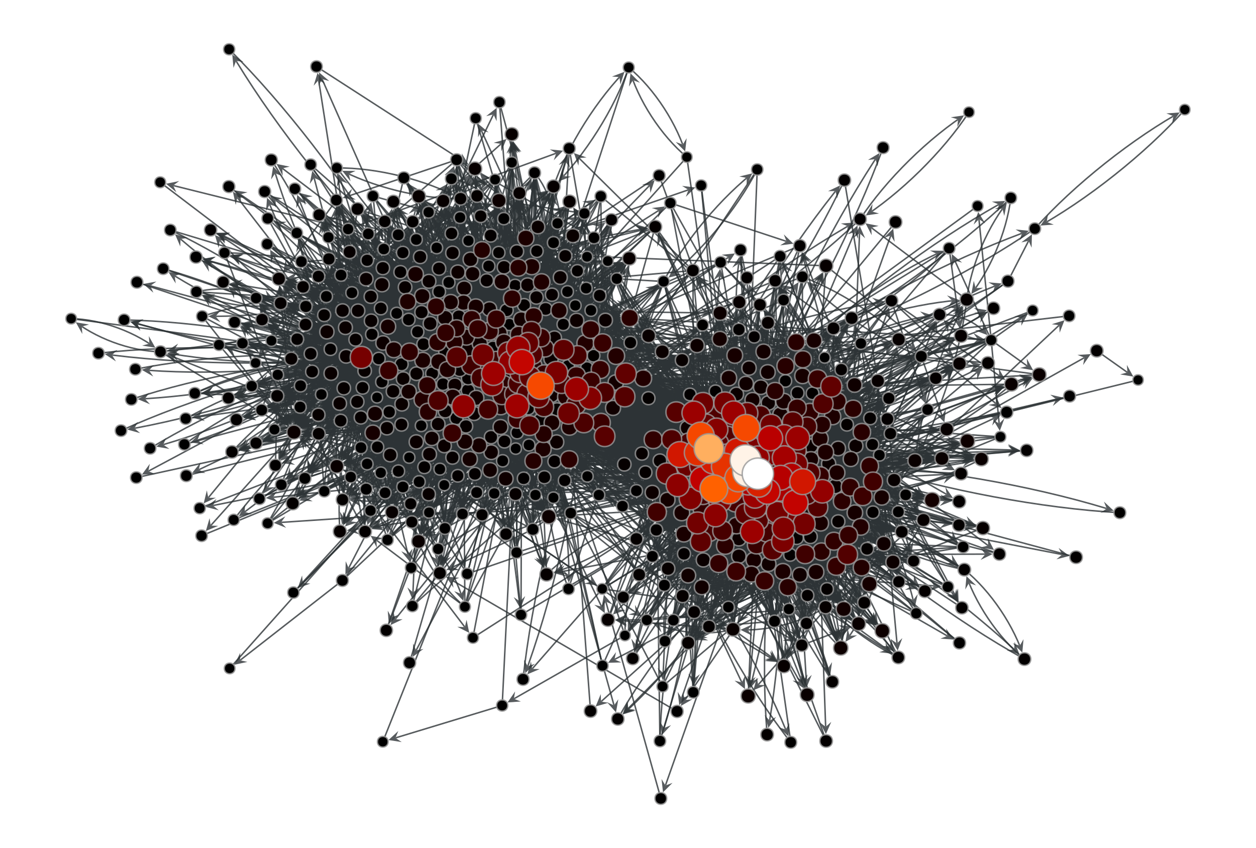 >>> g = gt.collection.data["polblogs"] >>> g = gt.GraphView(g, vfilt=gt.label_largest_component(g)) >>> ee, x, y = gt.hits(g) >>> gt.graph_draw(g, pos=g.vp["pos"], vertex_fill_color=x, ... vertex_size=gt.prop_to_size(x, mi=5, ma=15), ... vcmap=matplotlib.cm.gist_heat, ... vorder=x, output="polblogs_hits_auths.pdf") <...> >>> gt.graph_draw(g, pos=g.vp["pos"], vertex_fill_color=y, ... vertex_size=gt.prop_to_size(y, mi=5, ma=15), ... vcmap=matplotlib.cm.gist_heat, ... vorder=y, output="polblogs_hits_hubs.pdf") <...>