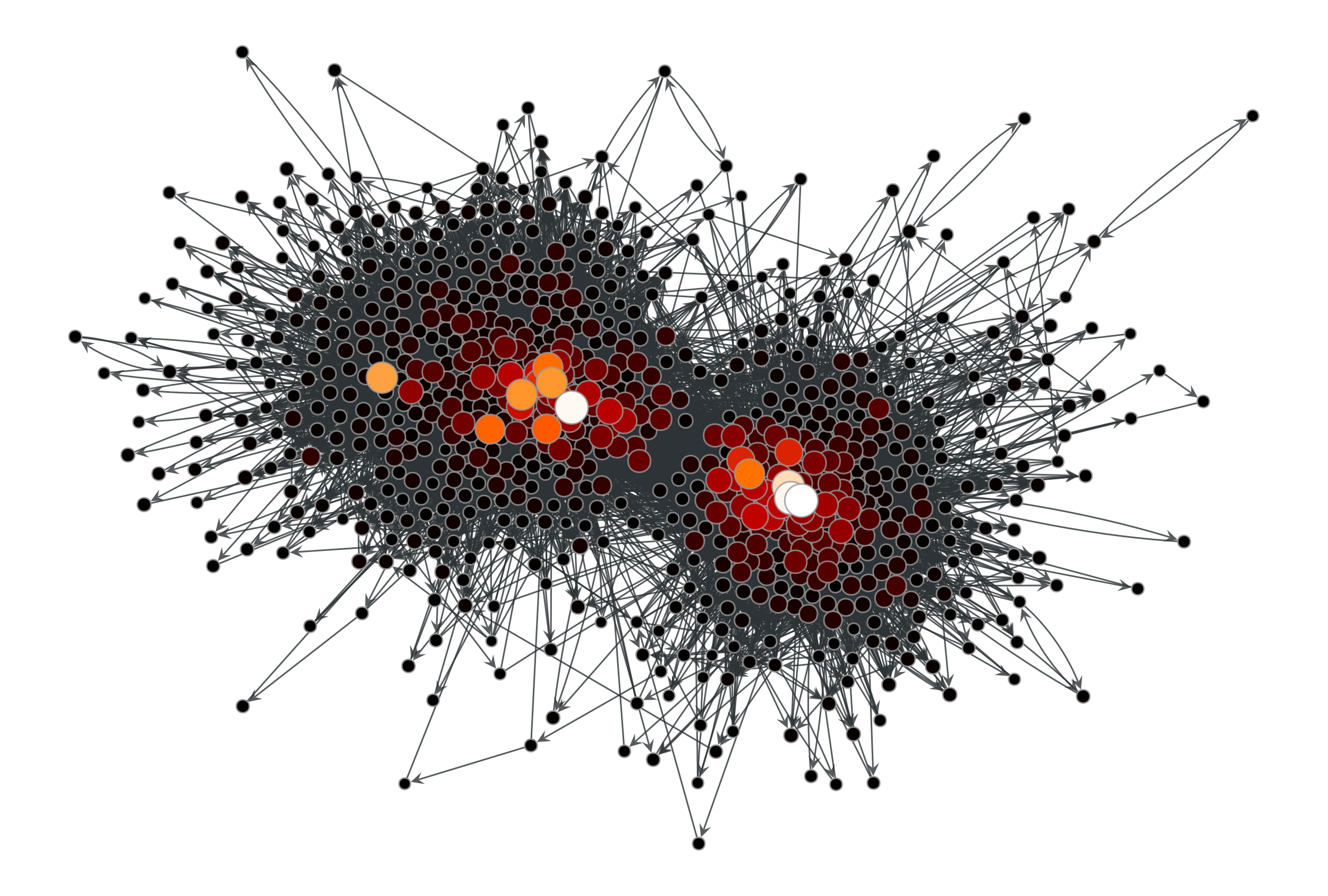 >>> g = gt.collection.data["polblogs"] >>> g = gt.GraphView(g, vfilt=gt.label_largest_component(g)) >>> w = g.new_edge_property("double") >>> w.a = np.random.random(len(w.a)) >>> x = gt.katz(g, weight=w) >>> gt.graph_draw(g, pos=g.vp["pos"], vertex_fill_color=x, ... vertex_size=gt.prop_to_size(x, mi=5, ma=15), ... vcmap=matplotlib.cm.gist_heat, ... vorder=x, output="polblogs_katz.pdf") <...>
