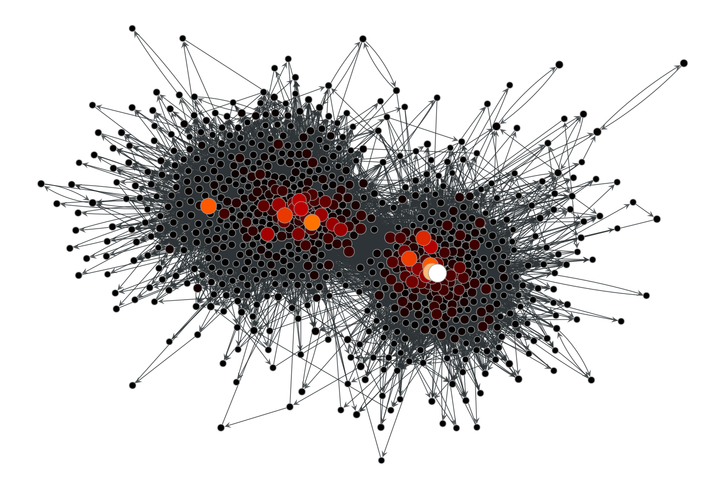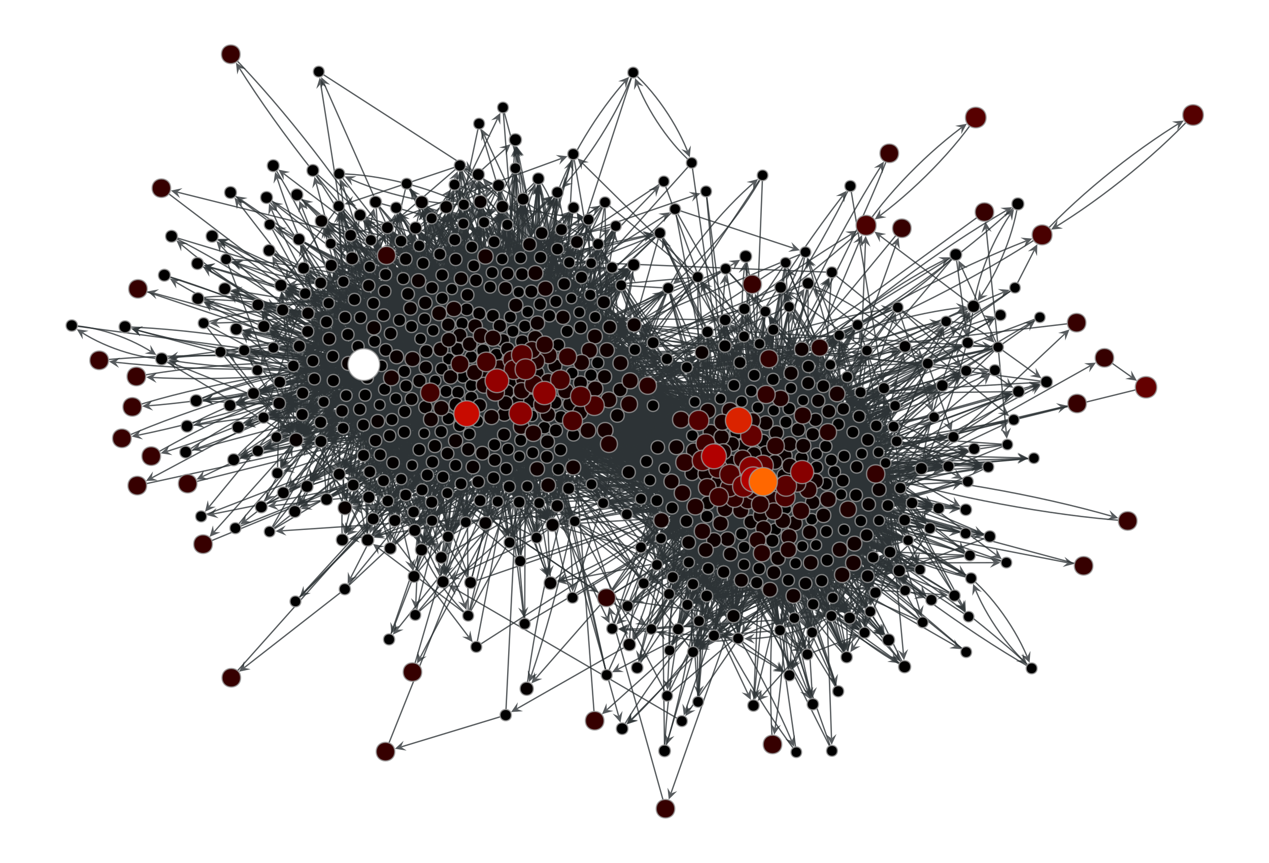 >>> g = gt.collection.data["polblogs"] >>> g = gt.GraphView(g, vfilt=gt.label_largest_component(g)) >>> pr = gt.pagerank(g) >>> gt.graph_draw(g, pos=g.vp["pos"], vertex_fill_color=pr, ... vertex_size=gt.prop_to_size(pr, mi=5, ma=15), ... vorder=pr, vcmap=matplotlib.cm.gist_heat, ... output="polblogs_pr.pdf") <...>