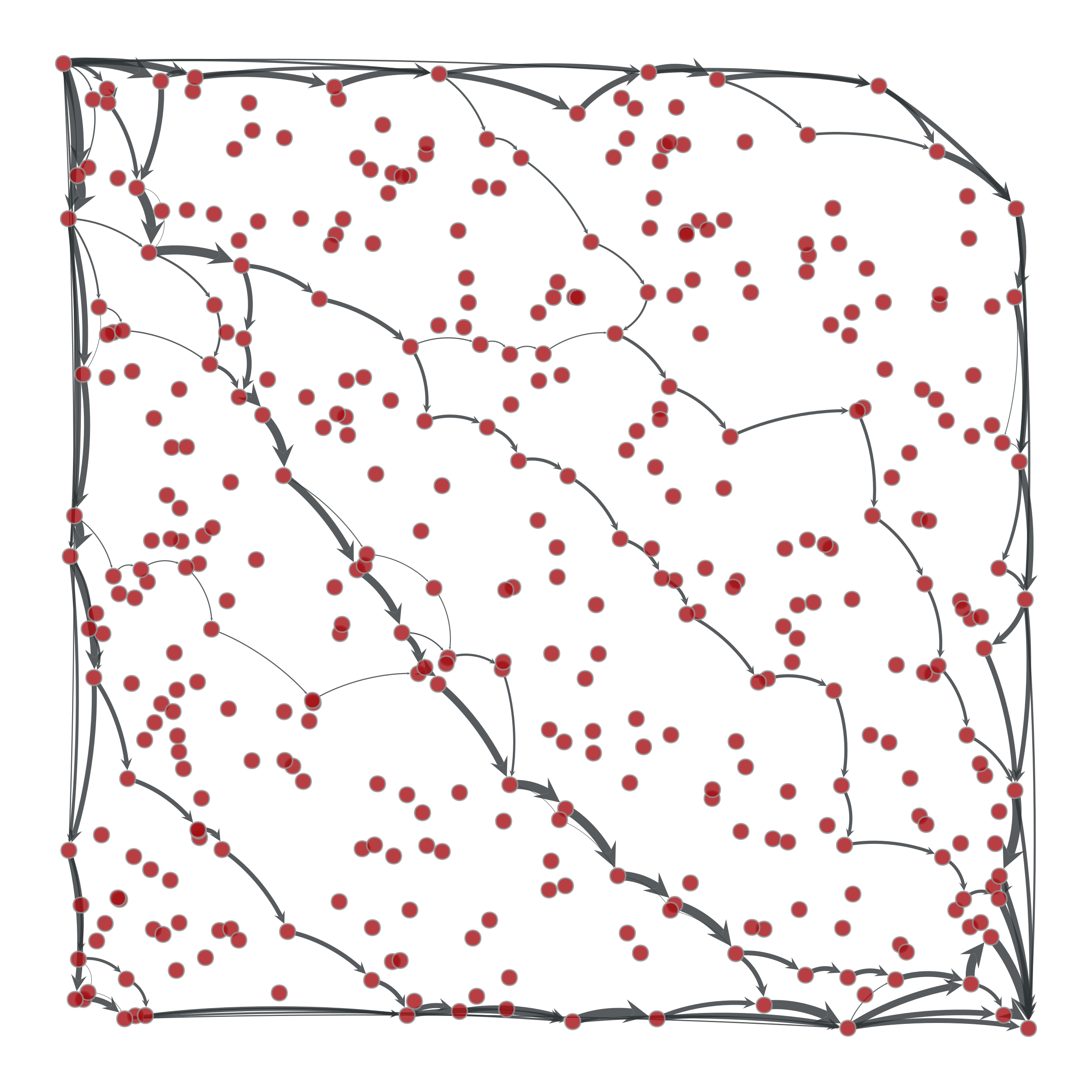 Edge flows obtained with the Edmonds-Karp algorithm. The source and target are on the upper left and lower right corners, respectively. The edge flows are represented by the edge width.#