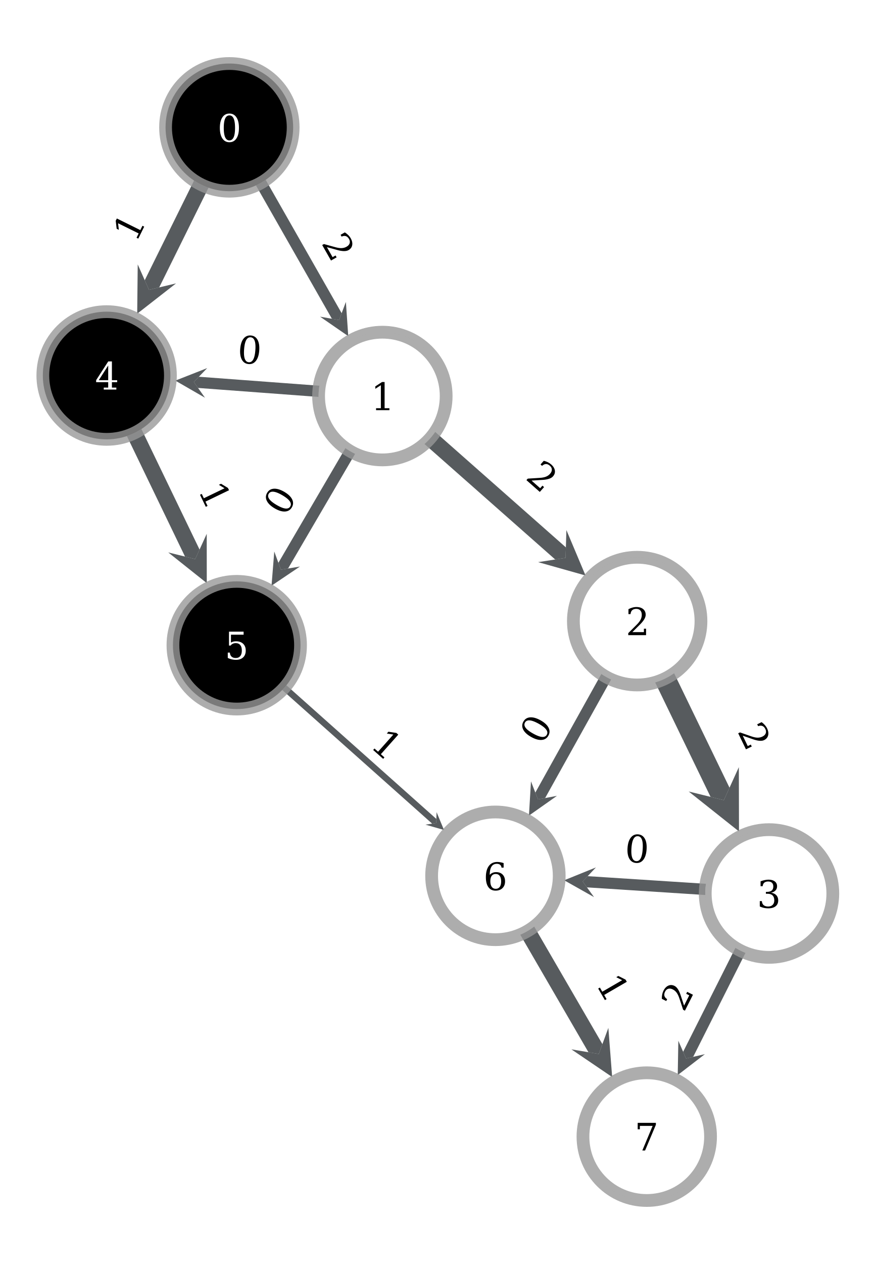 >>> g = gt.load_graph("../mincut-st-example.xml.gz") >>> cap = g.edge_properties["weight"] >>> src, tgt = g.vertex(0), g.vertex(7) >>> res = gt.boykov_kolmogorov_max_flow(g, src, tgt, cap) >>> part = gt.min_st_cut(g, src, cap, res) >>> mc = sum([cap[e] - res[e] for e in g.edges() if part[e.source()] != part[e.target()]]) >>> print(mc) 3 >>> pos = g.vertex_properties["pos"] >>> res.a = cap.a - res.a # the actual flow >>> gt.graph_draw(g, pos=pos, edge_pen_width=gt.prop_to_size(cap, mi=3, ma=10, power=1), ... edge_text=res, vertex_fill_color=part, vertex_text=g.vertex_index, ... vertex_font_size=18, edge_font_size=18, output="example-min-st-cut.pdf") <...>