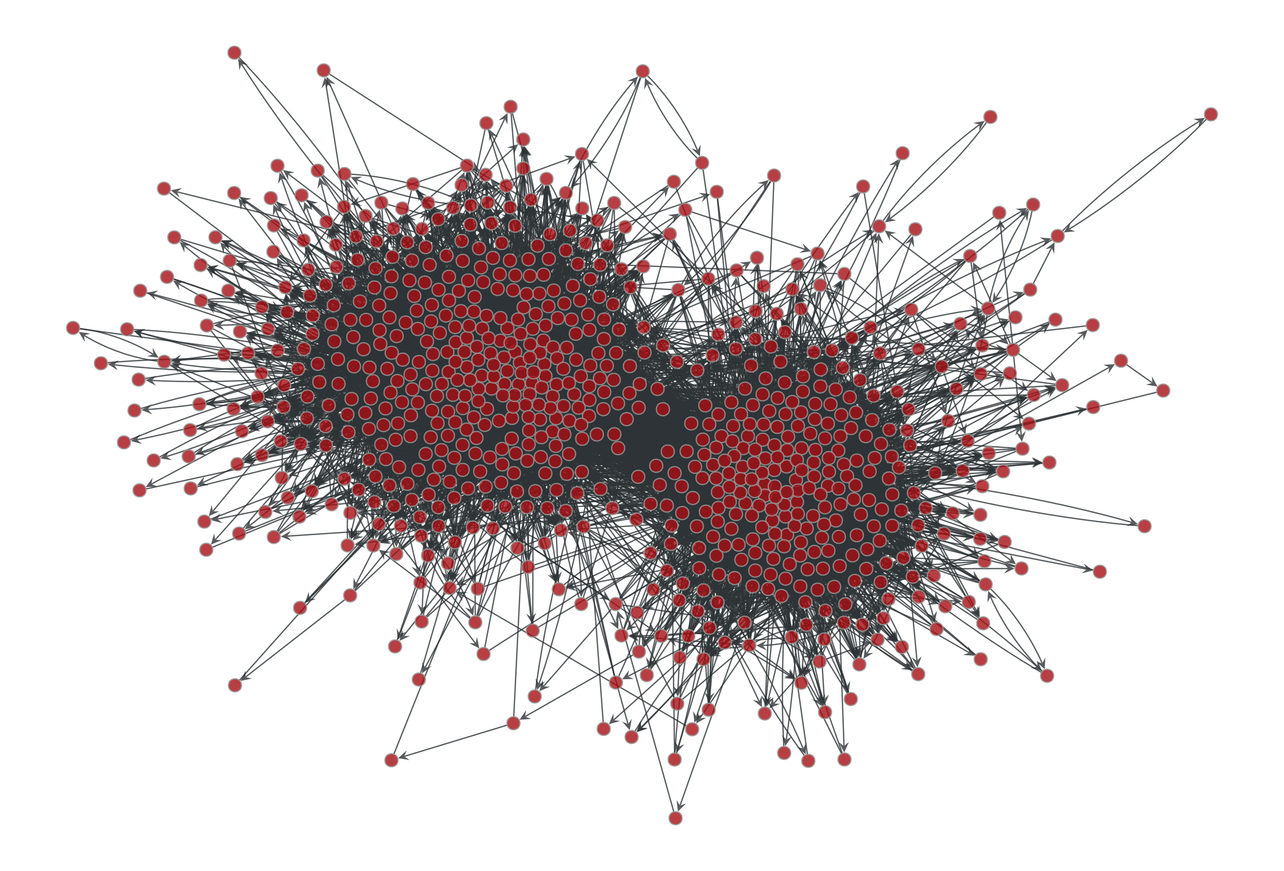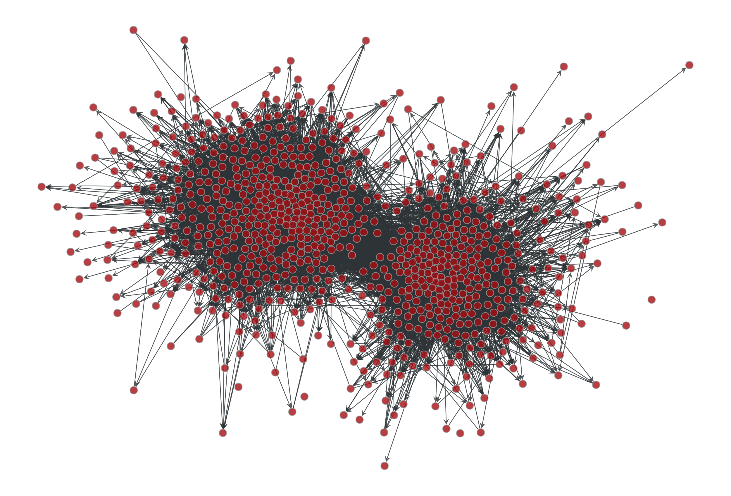 >>> g = gt.collection.data["polblogs"] >>> g = gt.GraphView(g, vfilt=gt.label_largest_component(g)) >>> g = gt.Graph(g, prune=True) >>> state = gt.minimize_blockmodel_dl(g) >>> u = gt.generate_sbm(state.b.a, gt.adjacency(state.get_bg(), ... state.get_ers()).T, ... g.degree_property_map("out").a, ... g.degree_property_map("in").a, directed=True) >>> gt.graph_draw(g, g.vp.pos, output="polblogs-sbm.pdf") <...> >>> gt.graph_draw(u, u.own_property(g.vp.pos), output="polblogs-sbm-generated.pdf") <...>