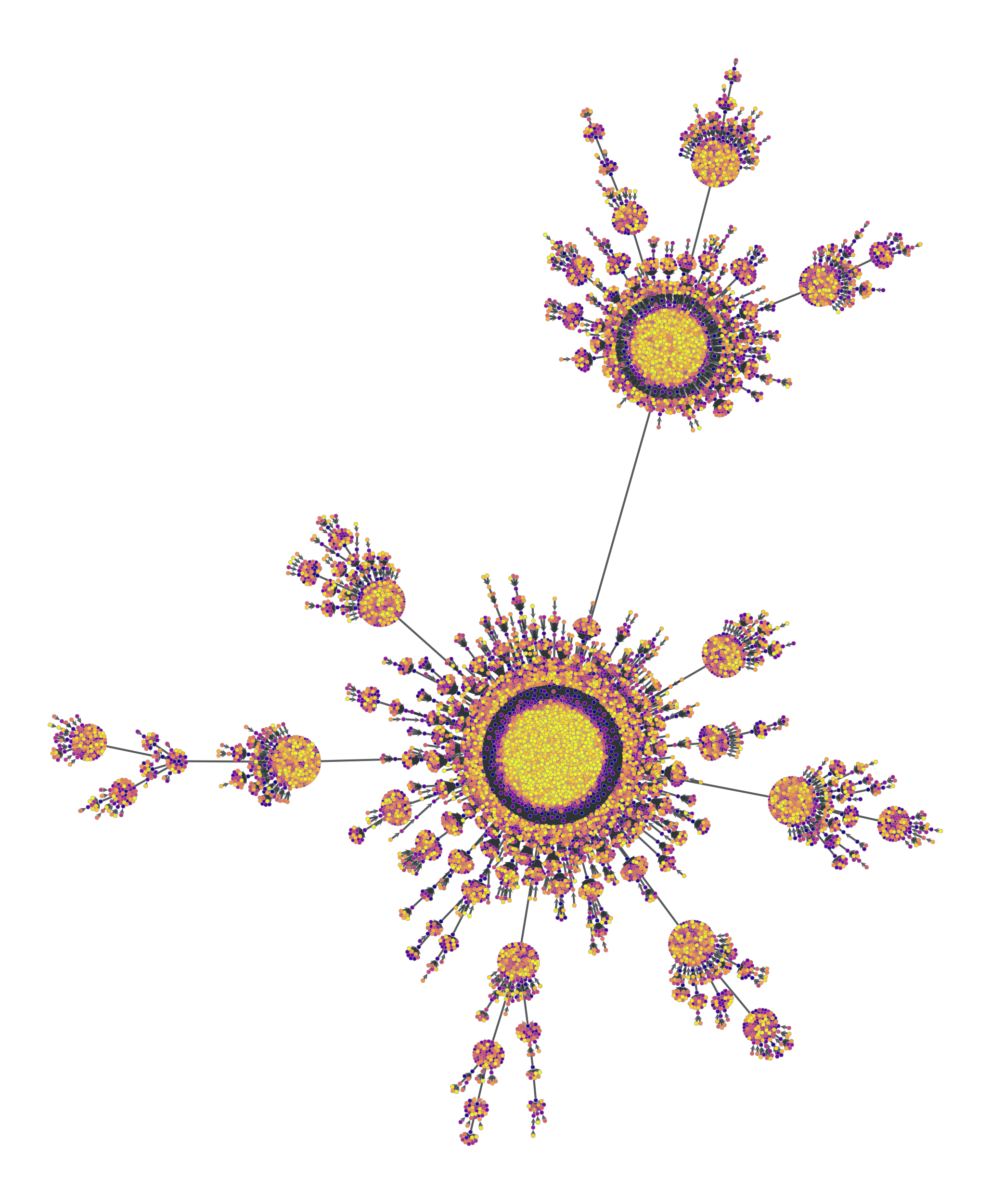 >>> g = gt.price_network(20000) >>> gt.graph_draw(g, pos=gt.sfdp_layout(g, cooling_step=0.99), ... vertex_fill_color=g.vertex_index, vertex_size=2, ... vcmap=matplotlib.cm.plasma, ... edge_pen_width=1, output="price-network.pdf") <...> >>> g = gt.price_network(20000, c=0.1) >>> gt.graph_draw(g, pos=gt.sfdp_layout(g, cooling_step=0.99), ... vertex_fill_color=g.vertex_index, vertex_size=2, ... vcmap=matplotlib.cm.plasma, ... edge_pen_width=1, output="price-network-broader.pdf") <...>