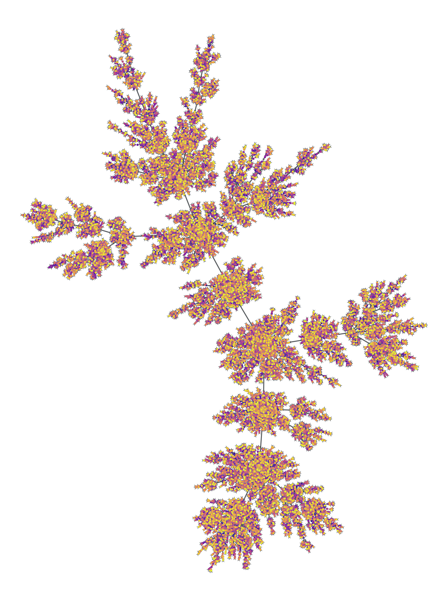 Price network with \(N=2\times 10^4\) vertices and \(c=0.1\). The colors represent the order in which vertices were added.#