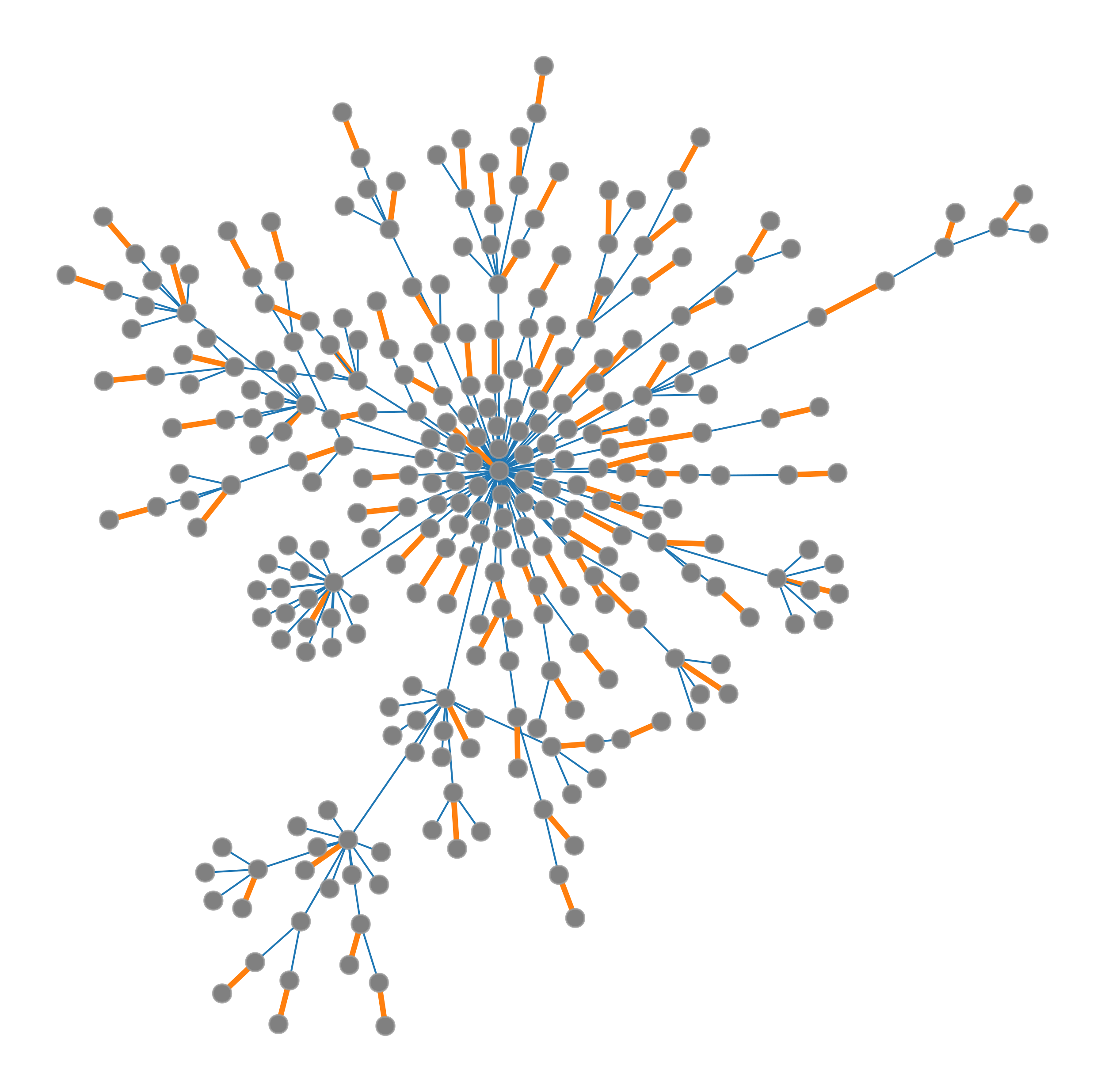 >>> g = gt.GraphView(gt.price_network(300), directed=False) >>> w = gt.max_cardinality_matching(g, edges=True) >>> gt.graph_draw(g, edge_color=w, edge_pen_width=w.t(lambda x: 2*x + 1), ... vertex_fill_color="grey", ecmap=matplotlib.cm.tab10, ... output="max_card_match.pdf") <...>