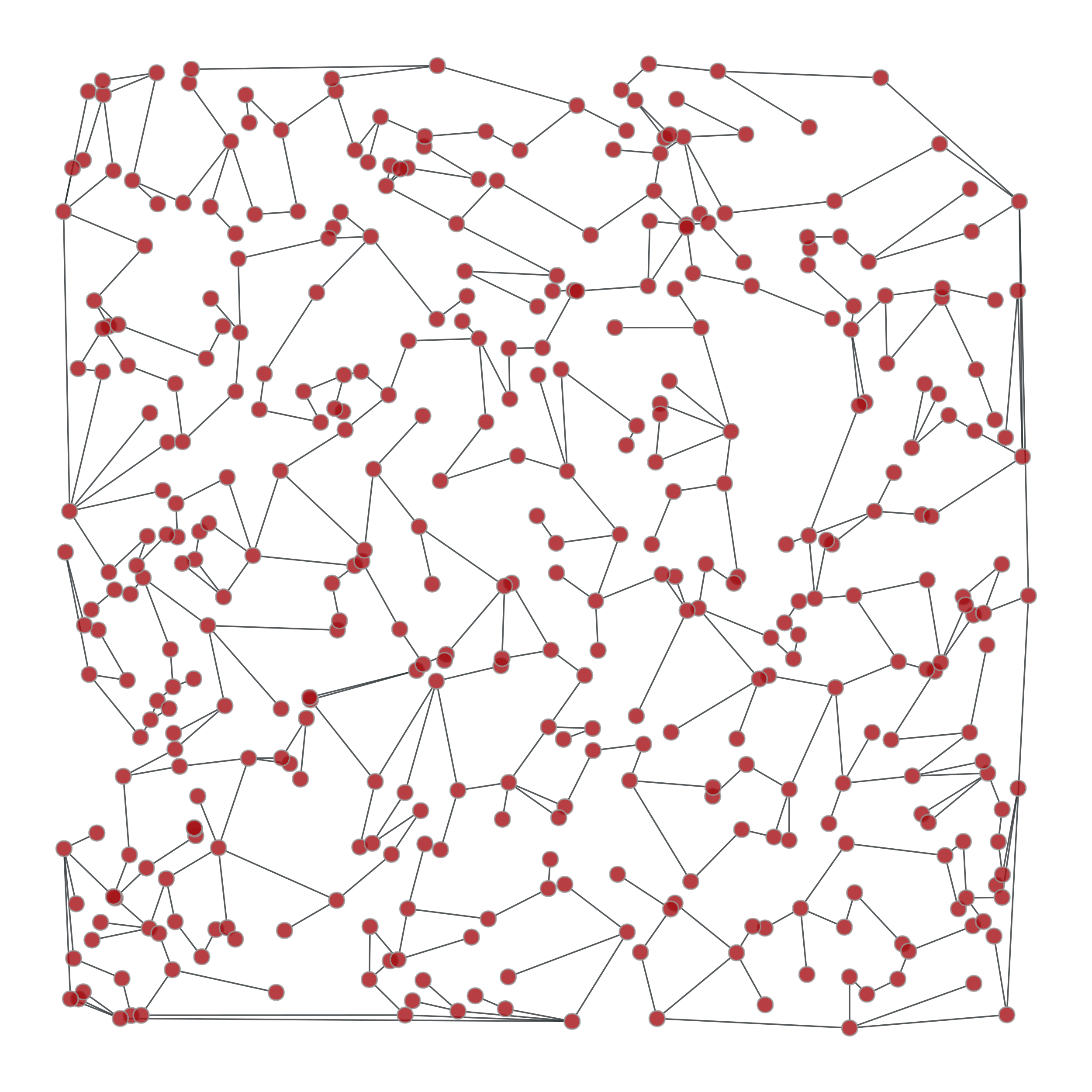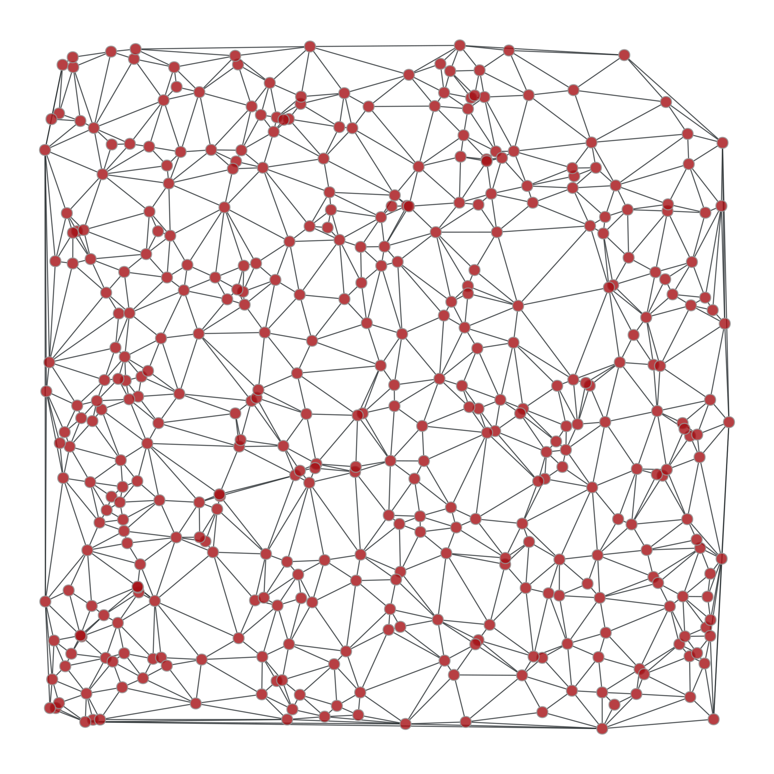 >>> from numpy.random import random >>> g, pos = gt.triangulation(random((400, 2)), type="delaunay") >>> weight = g.new_edge_property("double") >>> for e in g.edges(): ... weight[e] = linalg.norm(pos[e.target()].a - pos[e.source()].a) >>> tree = gt.random_spanning_tree(g, weights=weight) >>> tree2 = gt.random_spanning_tree(g, weights=weight) >>> gt.graph_draw(g, pos=pos, output="rtriang_orig.pdf") <...> >>> u = gt.GraphView(g, efilt=tree) >>> gt.graph_draw(u, pos=pos, output="triang_random_span_tree.pdf") <...> >>> u2 = gt.GraphView(g, efilt=tree2) >>> gt.graph_draw(u2, pos=pos, output="triang_random_span_tree2.pdf") <...>
