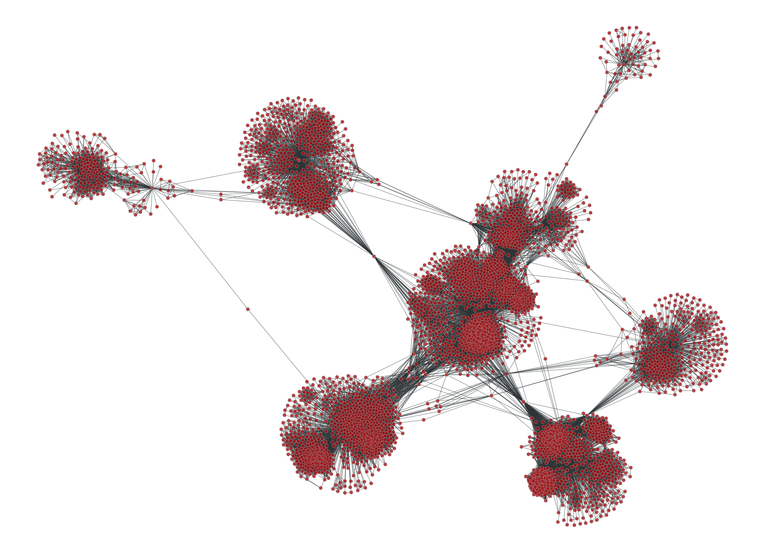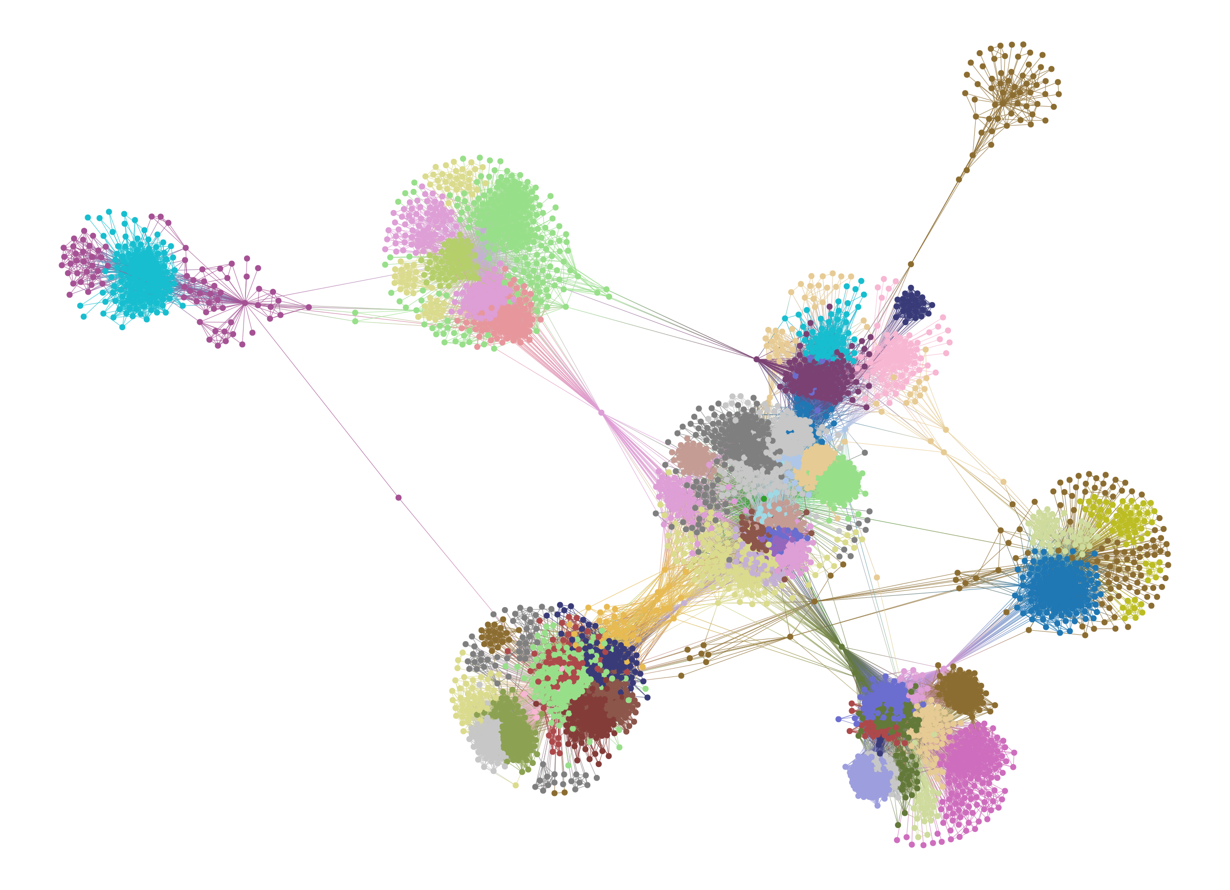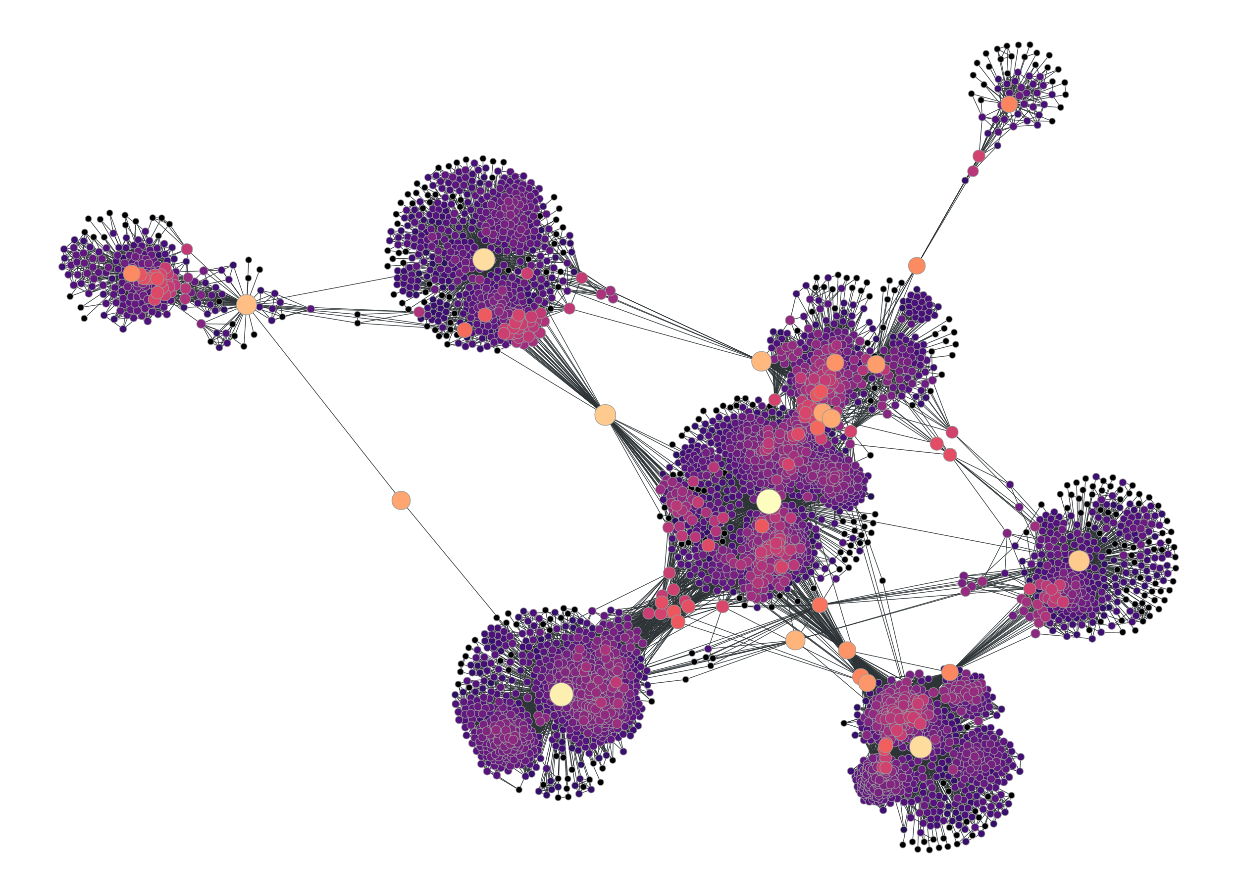 A composed view, obtained as the minimum spanning tree of all vertices in the graph which have a degree larger than four. The edge thickness indicates the betweeness values, as well as the node colors.#